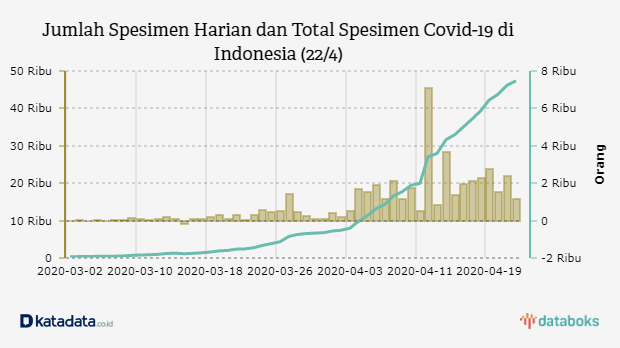 Jumlah tes spesimen Covid-19 yang dilakukan pemerintah masih berkisar dua ribu tes per harinya. Per Rabu (22/4), terdapat 1.188 spesimen yang dites. Angka tersebut menurun dari sehari sebelumnya yang sempat di titik 2.424 spesimen.