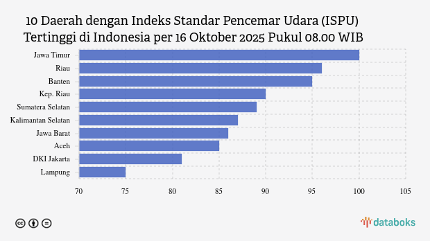 Berikut daftar 10 provinsi dengan indeks kualitas udara terburuk di Indonesia pada Kamis, 16 Oktober 2025 pukul 08.00 WIB.
