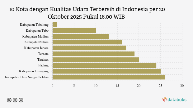 Berikut daftar lengkap 10 kota dengan kualitas udara paling bersih di Indonesia menurut KLHK pada Senin, 20 Oktober 2025 pukul 16.00 WIB.