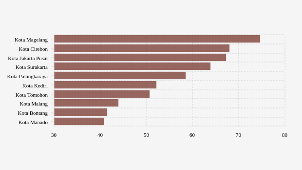Penggunaan rawat inap lima kabupaten/kota teratas dengan angka lebih dari 58,49 pasien per 100 ribu penduduk/minggu, yaitu kota Magelang, kota Cirebon, kota Jakarta Pusat, kota Surakarta dan kota Palangkaraya dengan masing-masing nilai 74,64 pasien per 100 ribu penduduk/minggu, 67,97 pasien per 100 ribu penduduk/minggu, 67,2 pasien per 100 ribu penduduk/minggu, 63,87 pasien per 100 ribu penduduk/minggu dan 58,49 pasien per 100 ribu penduduk/minggu.