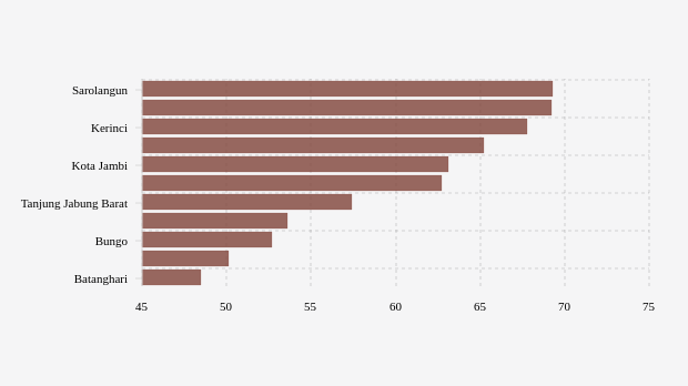 Kondisi yang sama terjadi di Tebo yang mencatatkan cakupan vaksinasi lansia sebesar 69,17 persen. Di kabupaten ini, cakupan vaksinasi lansia juga terlihat lebih tinggi dibandingkan pekan sebelumnya yang baru 69,06 persen. Di urutan berikutnya Kerinci. Kabupaten di provinsi Jambi ini mencatatkan cakupan vaksinasi lansia sebesar 67,82 persen