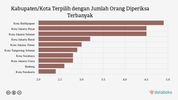 Wilayah di luar Jawa dengan angka jumlah orang diperiksa terbanyak beberapa di antaranya adalah kota Balikpapan, Badung dan Mimika dengan masing-masing jumlah orang diperiksa yakni 4,92 orang, 2,56 orang dan 2,19 orang.