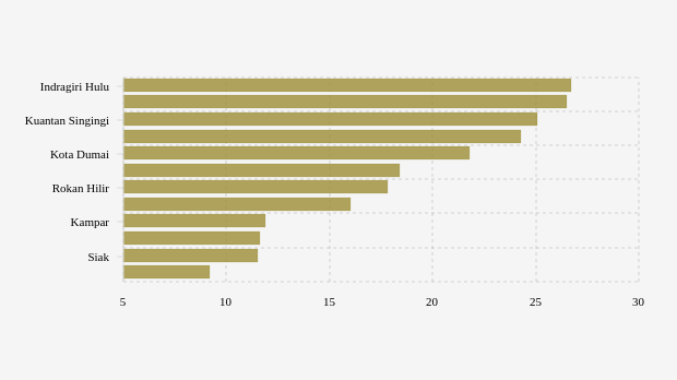 Kondisi yang sama terjadi di Indragiri Hilir yang mencatatkan positivity rate tujuh hari terakhir sebesar 26,51 persen. Di kabupaten ini, positivity rate tujuh hari terakhir juga terlihat lebih tinggi dibandingkan pekan sebelumnya yang baru 14,37 persen. Di urutan berikutnya Kuantan Singingi. Kabupaten di provinsi Riau ini mencatatkan positivity rate tujuh hari terakhir sebesar 25,15 persen