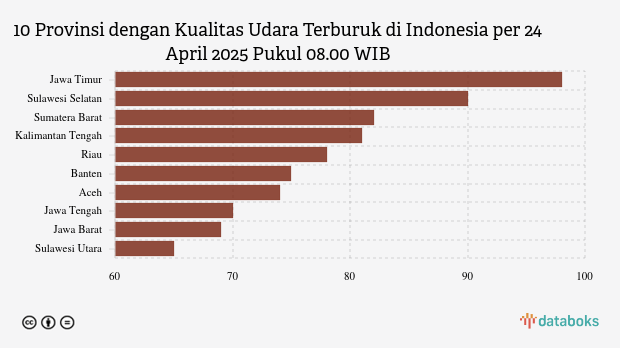 Berikut daftar 10 provinsi dengan indeks kualitas udara terburuk di Indonesia pada Kamis, 24 April 2025 pukul 08.00 WIB.