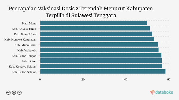 Kabupaten Muna di urutan pertama. Sampai dengan kemarin, untuk vaksinasi dosis 2 wilayah ini baru mencatatkan 49,79 persen. Angka ini menjadi yang terendah dibandingkan 17 kabupaten/kota lainnya. Sedangkan untuk pencapaian dosis 1, sampai dengan kemarin sudah tercapai 81,26 persen atau diikuti oleh 219,75 ribu peserta vaksin.