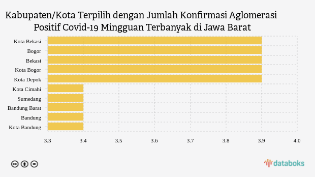Kota bekasi berada di urutan pertama dengan jumlah konfirmasi aglomerasi positif covid-19 mingguan terbanyak sebesar 3,92 jiwa per 100 ribu penduduk/minggu. Kondisi jumlah konfirmasi aglomerasi positif covid-19 mingguan di kota ini memperlihatkan ada kemajuan dengan adanya penurunan dibandingkan pekan sebelumnya yang tercatat 6,34 jiwa per 100 ribu penduduk/minggu.