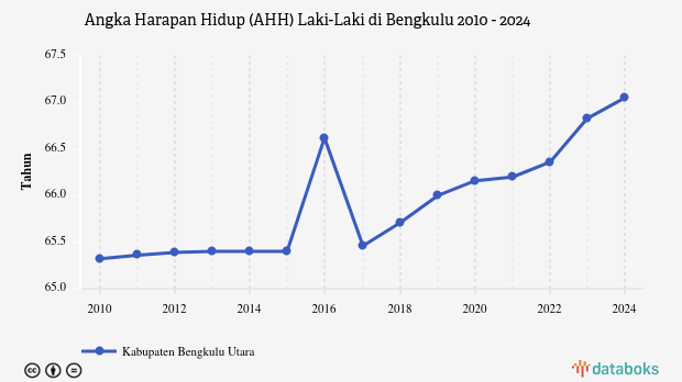 Secara historis, AHH laki-laki di Kabupaten Bengkulu Utara mengalami fluktuasi. Kenaikan tertinggi terjadi pada tahun 2017 dengan pertumbuhan sebesar 1,87% atau 1,22 tahun. Sementara itu, penurunan terendah terjadi pada tahun 2018 dengan penurunan -1,74% atau -1,16 tahun. Jika dibandingkan dengan rata-rata AHH laki-laki dalam lima tahun terakhir (2019-2023) yaitu 66,29 tahun, maka AHH tahun 2024 menunjukkan pertumbuhan yang lebih baik.