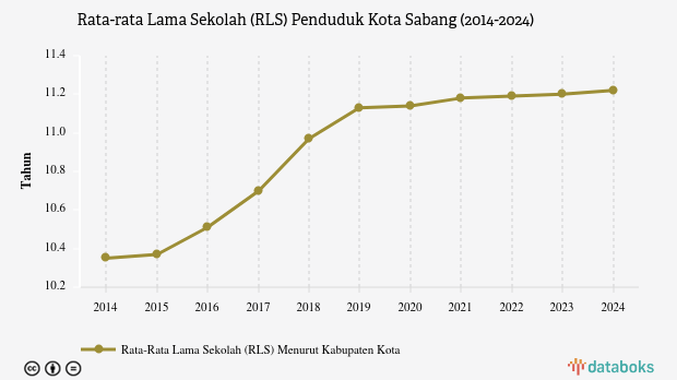 RLS penduduk Kota Sabang meningkat 0,02 tahun (0,18%) dibanding tahun sebelumnya yang selama 11,2 tahun. Sementara, dalam lima tahun terakhir RLS tersebut naik 0,09 tahun (0,81%).