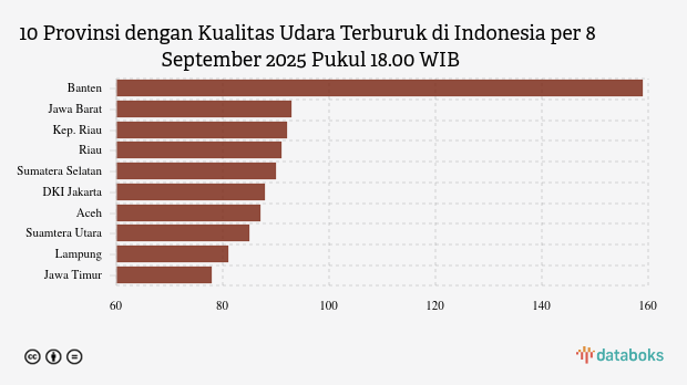 Kualitas Udara di Banten malam ini terburuk di Indonesia. Berdasarkan halaman Indeks Standar Pencemar Udara (ISPU) Kementerian Lingkungan Hidup dan Kehutanan (KLHK) pada Senin (8/9/2025) pukul 18.00 WIB terungkap bahwa indeks kualitas udara di Banten sebesar 159.