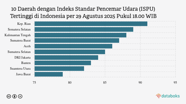 Berikut daftar 10 provinsi dengan indeks kualitas udara terburuk di Indonesia pada Jumat, 29 Agustus 2025 pukul 18.00 WIB.