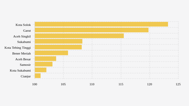 Vaksinasi lansia lima kabupaten/kota teratas dengan angka lebih dari 108,23 persen, yaitu kota Solok, Garut, Aceh Singkil, Sukabumi dan kota Tebing Tinggi dengan masing-masing nilai 123,22 persen, 119,85 persen, 115,5 persen, 108,28 persen dan 108,23 persen.