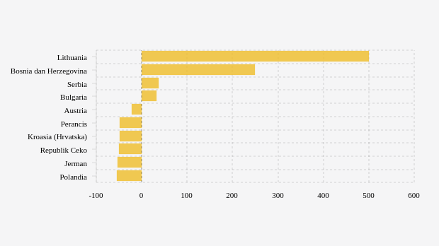 Secara persentase, lima negara teratas dengan penambahan kematian tertinggi yakni Lithuania, Bosnia dan Herzegovina, Serbia, Bulgaria dan Austria. Total kematian di lima negara tersebut per Senin, 22 Mei 2023 sebanyak 47 jiwa dengan pertumbuhan mingguan di atas -22,22 persen.