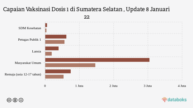 Cakupan vaksinasi dosis 1 di provinsi Sumatera Selatan, hingga kemarin Sabtu, 8 Januari 2022, telah mencapai 78,05 persen. Angka ini setara dengan 4,92 juta peserta vaksin dari target yang ditetapkan sebanyak 6,3 juta orang. Sementara untuk vaksinasi dosis 2 hingga kemarin telah tercapai 45,1 persen dari target.