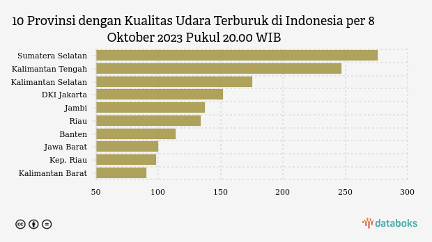 Berikut daftar 10 provinsi dengan indeks kualitas udara terburuk di Indonesia pada Minggu, 8 Oktober 2023 pukul 20.00 WIB.