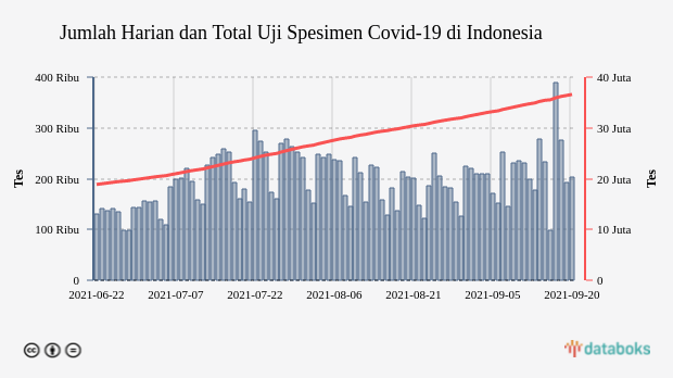 Tes Covid-19 di Indonesia pada Senin, 20 September 2021 sebanyak 202,79 ribu spesimen. Jumlah ini lebih tinggi dibandingkan spesimen yang diuji pada hari sebelumya. Hingga hari ini, total spesimen yang telah diperiksa sebanyak 36,6 juta.