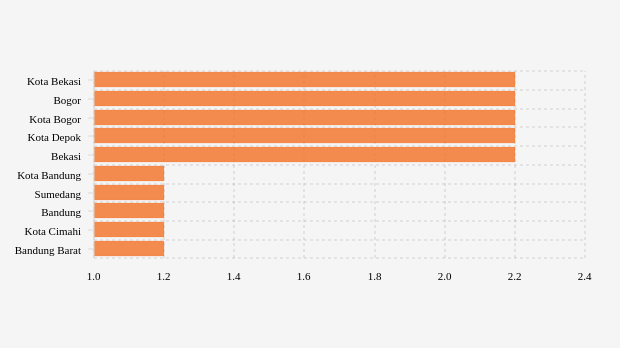 Kondisi yang sama terjadi di Bogor yang mencatatkan jumlah konfirmasi aglomerasi positif Covid-19 mingguan sebesar 2,23 jiwa per 100 ribu penduduk/minggu. Di kota ini, jumlah konfirmasi aglomerasi positif Covid-19 mingguan juga terlihat lebih tinggi dibandingkan pekan sebelumnya yang baru 2,22 jiwa per 100 ribu penduduk/minggu. Di urutan berikutnya kota Bogor. Kota di provinsi Jawa Barat ini mencatatkan jumlah konfirmasi aglomerasi positif Covid-19 mingguan sebesar 2,23 jiwa per 100 ribu penduduk/minggu