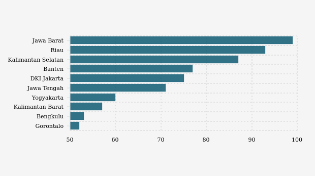 Di bawah Jawa Barat, ada Riau yang menempati posisi kedua terburuk di Indonesia dengan indeks kualitas udara 93. Kemudian, di posisi ketiga ada Kalimantan Selatan dengan indeks kualitas udara 87.