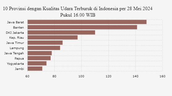 Berikut daftar 10 provinsi dengan indeks kualitas udara terburuk di Indonesia pada Selasa, 28 Mei 2024 pukul 16.00 WIB.