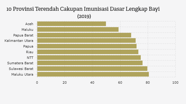 Menurut catatan Badan Pusat Statistik (BPS) tahun 2019, Aceh merupakan provinsi terendah dalam cakupan imunisasi dasar lengkap pada bayi yaitu hanya 49,6%. Artinya, lebih dari setengah bayi di Aceh tidak mendapatkan imunisasi dasar lengkap.