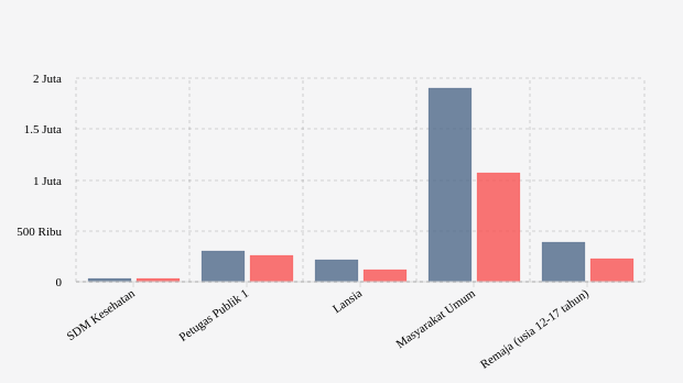 Berdasarkan kelompok sasaran, rincian vaksinasi untuk menangkal virus Covid-19 di provinsi ini yakni kelompok SDM kesehatan dengan target 27,64 ribu peserta. Pada dosis 1, berhasil dilakukan vaksinasi sebanyak 27,64 ribu jiwa (127,27 persen target) dan untuk vaksinasi dosis 2 telah tercapai 118,62 persen atau 32,78 ribu jiwa.