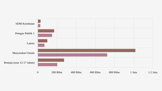 Berdasarkan kelompok sasaran, rincian vaksinasi untuk menangkal virus Covid-19 di provinsi ini yakni kelompok SDM kesehatan dengan target 20,44 ribu peserta. Pada dosis 1, berhasil dilakukan vaksinasi sebanyak 20,44 ribu jiwa (130,08 persen target) dan untuk vaksinasi dosis 2 telah tercapai 125,66 persen atau 25,68 ribu jiwa.