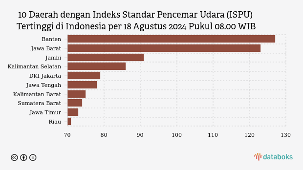 Berikut daftar 10 provinsi dengan indeks kualitas udara terburuk di Indonesia pada Minggu, 18 Agustus 2024 pukul 08.00 WIB.