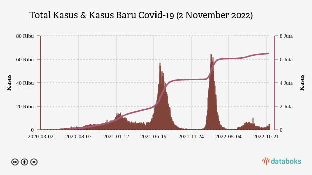 Pasien positif Covid-19 bertambah 4.873 orang per 2 November 2022. Dengan tambahan tersebut, saat ini total kasus Covid-19 di Indonesia telah mencapai 6.502.659.
