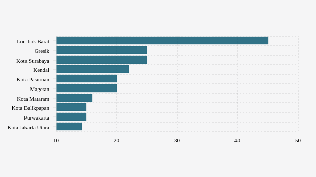 tracing lima kabupaten/kota teratas dengan angka lebih dari 20 persen, yaitu Lombok Barat, Gresik, kota Surabaya, Kendal dan kota Pasuruan dengan masing-masing nilai 45 persen, 25 persen, 25 persen, 22 persen dan 20 persen.