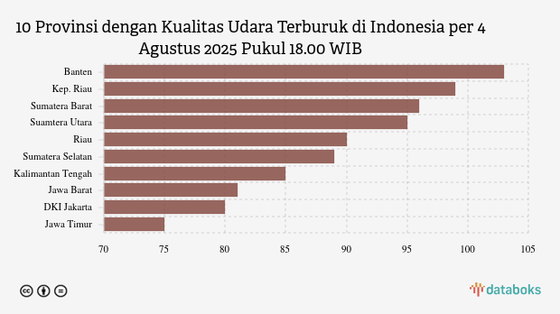 Berikut daftar 10 provinsi dengan indeks kualitas udara terburuk di Indonesia pada Senin, 4 Agustus 2025 pukul 18.00 WIB.
