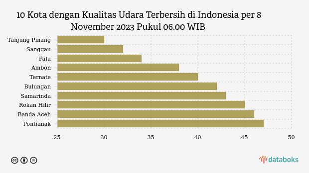 Daftar kota-kota dengan kualitas udara paling bersih di Indonesia menurut Kementerian Lingkungan Hidup dan Kehutanan (KLHK) pada Rabu, 8 November 2023 pukul 06.00 WIB.