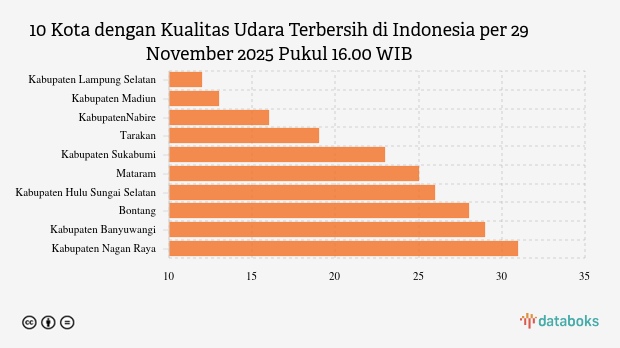 Berikut 10 kota dengan tingkat konsentrasi PM 2.5 di udara terendah di Indonesia pada September 2023: