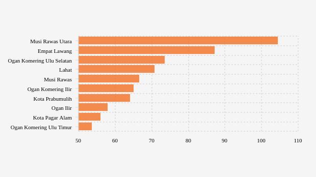 Musi rawas utara adalah kabupaten di urutan pertama dengan cakupan vaksinasi lansia tertinggi sebesar 104,43 persen. Kondisi cakupan vaksinasi lansia di kabupaten ini terlihat lebih baik dibandingkan pekan sebelumnya yang tercatat 104,41 persen.