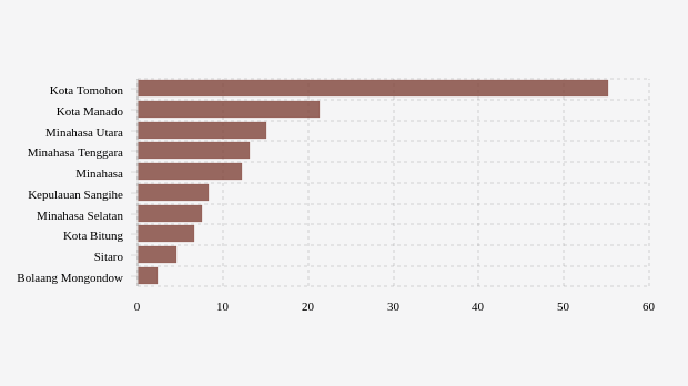 Kondisi yang sama terjadi di kota Manado yang mencatatkan jumlah konfirmasi positif Covid-19 mingguan sebesar 21,43 jiwa per 100 ribu penduduk/minggu. Di kota ini, jumlah konfirmasi positif Covid-19 mingguan juga terlihat lebih tinggi dibandingkan pekan sebelumnya yang baru 17,75 jiwa per 100 ribu penduduk/minggu. Di urutan berikutnya Minahasa Utara. Kota di provinsi Sulawesi Utara ini mencatatkan jumlah konfirmasi positif Covid-19 mingguan sebesar 15,13 jiwa per 100 ribu penduduk/minggu