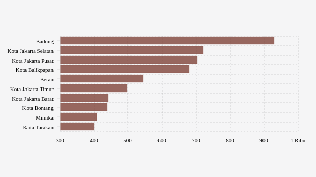 Urutan lima teratas dimulai dari yang terbesar adalah Badung, kota Jakarta Selatan, kota Jakarta Pusat, kota Balikpapan dan Berau dengan masing-masing persentase 929,95 persen, 720,95 persen, 702,84 persen, 679,66 persen dan 544,96 persen.