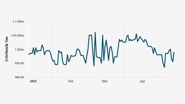 Harga minyak sawit (Crude Palm Oil/CPO) di Pasar Spot Rotterdam tetap bertahan dalam 44 hari terakhir di angka US$ 1.027,5 per Metrik Ton pada perdagangan Jumat, 12 Mei 2023. Harga CPO sempat menyentuh level tertingginya US$ 1.065 per Metrik Ton yang terjadi pada Senin, 02 Januari 2023.