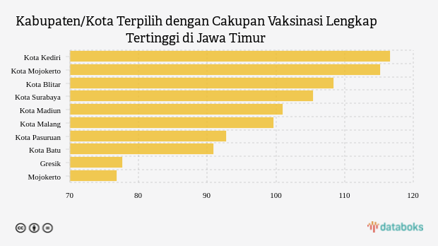 Kota kediri berada di urutan pertama dengan cakupan vaksinasi lengkap tertinggi sebesar 116,58 persen. Kondisi cakupan vaksinasi lengkap di kota ini terlihat lebih baik dibandingkan pekan sebelumnya yang tercatat 116,49 persen.