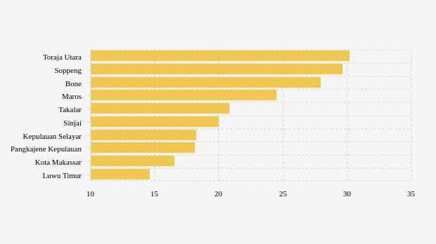 Kondisi yang sama terjadi di Soppeng yang mencatatkan positivity rate tujuh hari terakhir sebesar 29,63 persen. Di kabupaten ini, positivity rate tujuh hari terakhir juga terlihat lebih tinggi dibandingkan pekan sebelumnya yang baru 14,66 persen. Di urutan berikutnya Bone. Kabupaten di provinsi Sulawesi Selatan ini mencatatkan positivity rate tujuh hari terakhir sebesar 27,94 persen