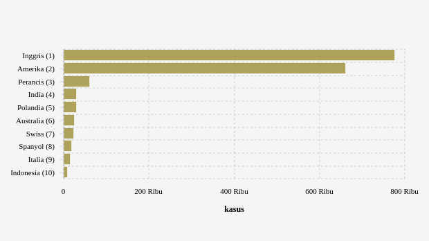 Selanjutnya, jumlah omicron">kasus Omicron di Perancis naik 8,36 persen menjadi 59.989 kasus dibandingkan pekan sebelumnya, India dengan jumlah omicron">kasus Omicron 28.953 kasus (naik 24,32%) dan jumlah kasus Omicron di Polandia naik 6,17 persen menjadi 28.860 kasus dibandingkan pekan sebelumnya