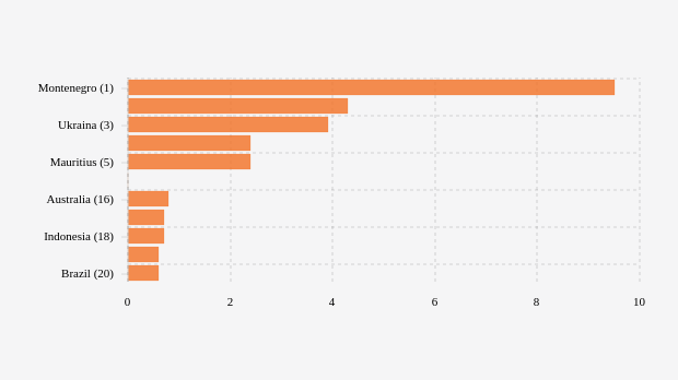 Berikutnya, Ukraina dengan penambahan kasus Omicron 1.765 kasus (naik 3,88%), penambahan kasus Omicron di Singapura naik 2,43 persen menjadi 20.834 kasus dibandingkan pekan sebelumnya dan Mauritius dengan penambahan kasus Omicron 6.002 kasus (naik 2,41%)