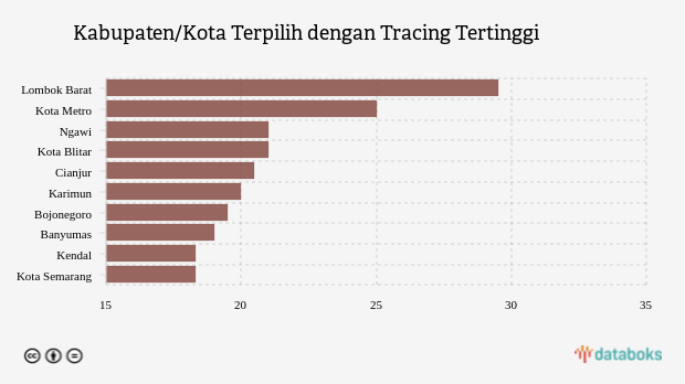 tracing lima kabupaten/kota teratas dengan angka lebih dari 20,5 persen, yaitu Lombok Barat, kota Metro, Ngawi, kota Blitar dan Cianjur dengan masing-masing nilai 29,5 persen, 25 persen, 21 persen, 21 persen dan 20,5 persen.