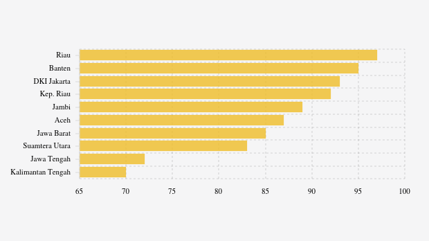 Di bawah Riau, ada Banten yang menempati posisi kedua terburuk di Indonesia dengan indeks kualitas udara 95. Kemudian, di posisi ketiga ada DKI Jakarta dengan indeks kualitas udara 93.