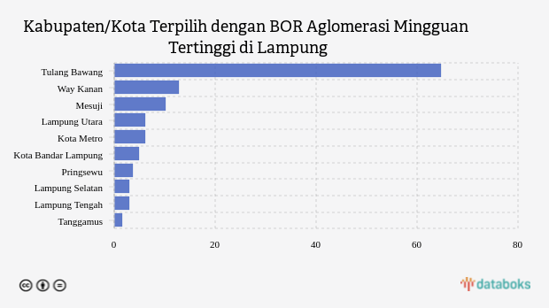 Tulang bawang adalah kabupaten di urutan pertama dengan BOR aglomerasi mingguan tertinggi sebesar 64,71 persen. Kondisi BOR aglomerasi mingguan di kabupaten ini memperlihatkan ada kemajuan dengan adanya penurunan dibandingkan pekan sebelumnya yang tercatat 64,71 persen.