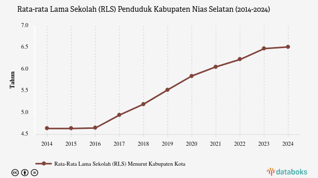 Rata-rata lama sekolah (RLS) penduduk berusia 25 tahun ke atas di Nias Selatan, Sumatera Utara mencapai 6,52 tahun pada 2024.