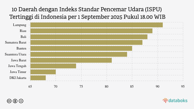 Berikut daftar 10 provinsi dengan indeks kualitas udara terburuk di Indonesia pada Senin, 1 September 2025 pukul 18.00 WIB.