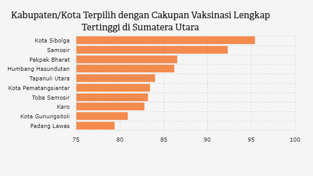 Kota sibolga berada di urutan pertama dengan cakupan vaksinasi lengkap tertinggi sebesar 95,44 persen. Kondisi cakupan vaksinasi lengkap di kota ini terlihat lebih baik dibandingkan pekan sebelumnya yang tercatat 95,21 persen.