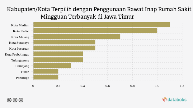 Kota Surabaya dan kota Pasuruan berada di posisi selanjutnya dengan catatan penggunaan rawat inap rumah sakit mingguan sebesar 0,54 pasien per 100 ribu penduduk/minggu dan 0,49 pasien per 100 ribu penduduk/minggu.