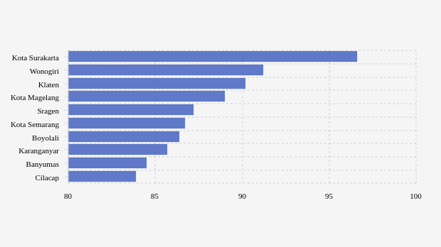 Kota surakarta berada di urutan pertama dengan cakupan vaksinasi lengkap sesuai KTP tertinggi sebesar 96,57 persen. Kondisi cakupan vaksinasi lengkap sesuai KTP di kota ini terlihat menurun dibandingkan pekan sebelumnya yang tercatat 106,96 persen.