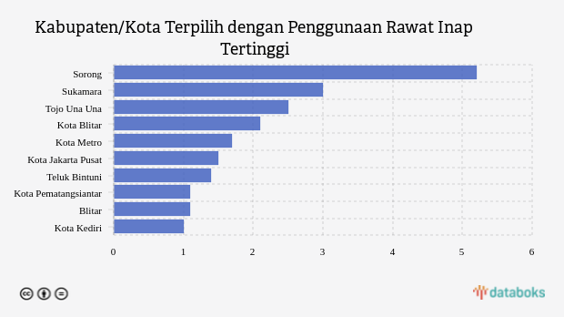 Penggunaan rawat inap lima kabupaten/kota teratas dengan angka lebih dari 1,72 pasien per 100 ribu penduduk/minggu, yaitu Sorong, Sukamara, Tojo Una Una, kota Blitar dan kota Metro dengan masing-masing nilai 5,21 pasien per 100 ribu penduduk/minggu, 2,98 pasien per 100 ribu penduduk/minggu, 2,54 pasien per 100 ribu penduduk/minggu, 2,07 pasien per 100 ribu penduduk/minggu dan 1,72 pasien per 100 ribu penduduk/minggu.