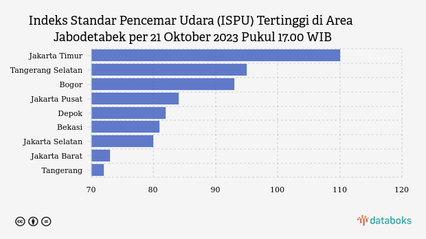 Kualitas udara Jakarta Timur sore ini terburuk di Jabodetabek berdasarkan data Indeks Standar Pencemar Udara (ISPU) KLHK. Adapun indeks kualitas udara Jakarta Timur tercatat 110 pada Sabtu (21/10/2023) pukul 17.00 WIB.
