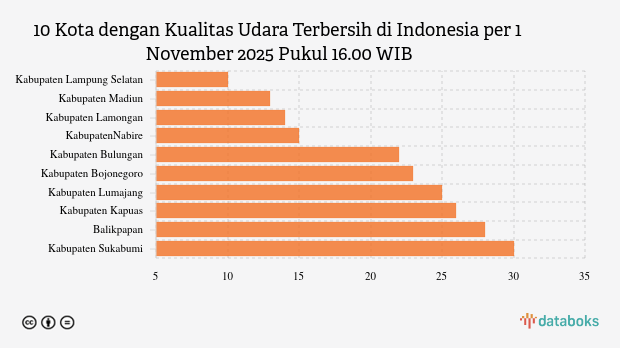 Kualitas udara Kabupaten Lampung Selatan sore ini paling bersih di Indonesia. Berdasarkan indeks kualitas udara versi Kementerian Lingkungan Hidup dan Kehutanan (KLHK), Kabupaten Lampung Selatan memiliki skor 10 pada Sabtu (1/11/2025) pukul 16.00 WIB.